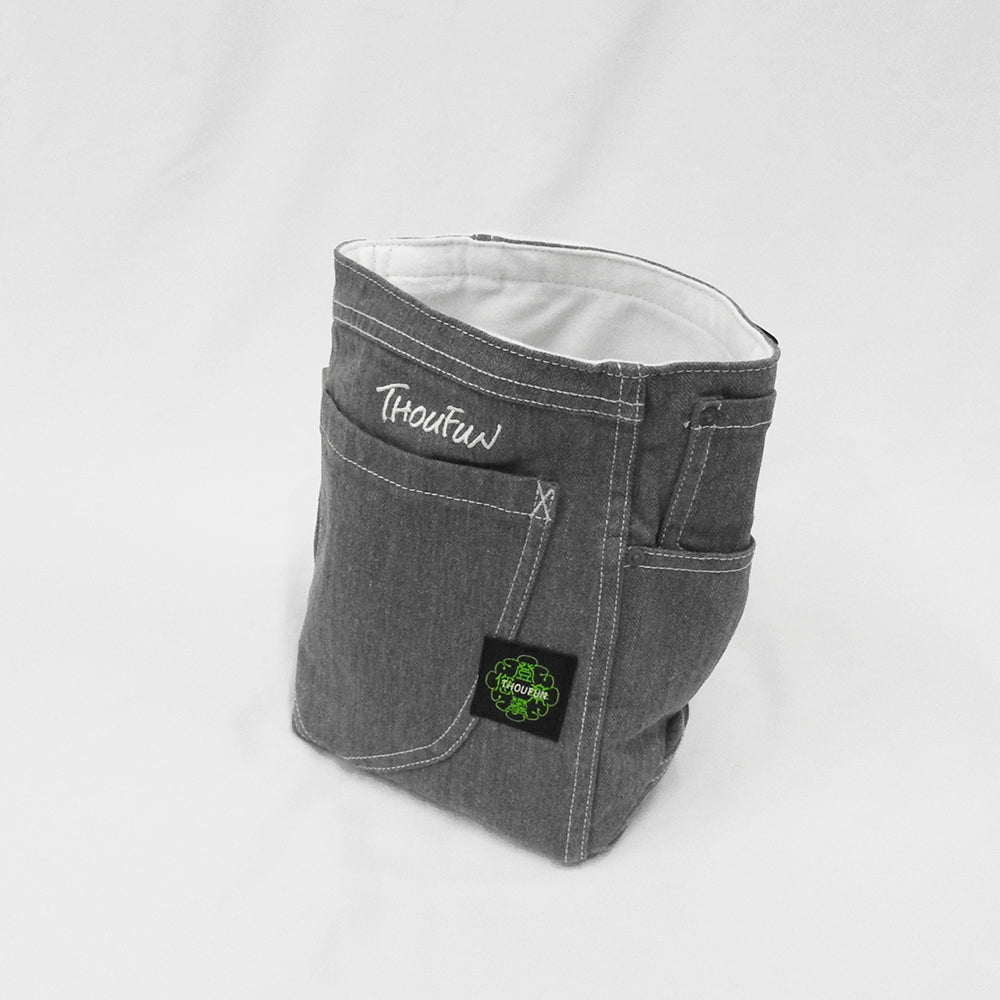 底の生地を二重にし、底に重心をおくことでチョークバッグが倒れることを防ぎます。物を入れることでより安定します。